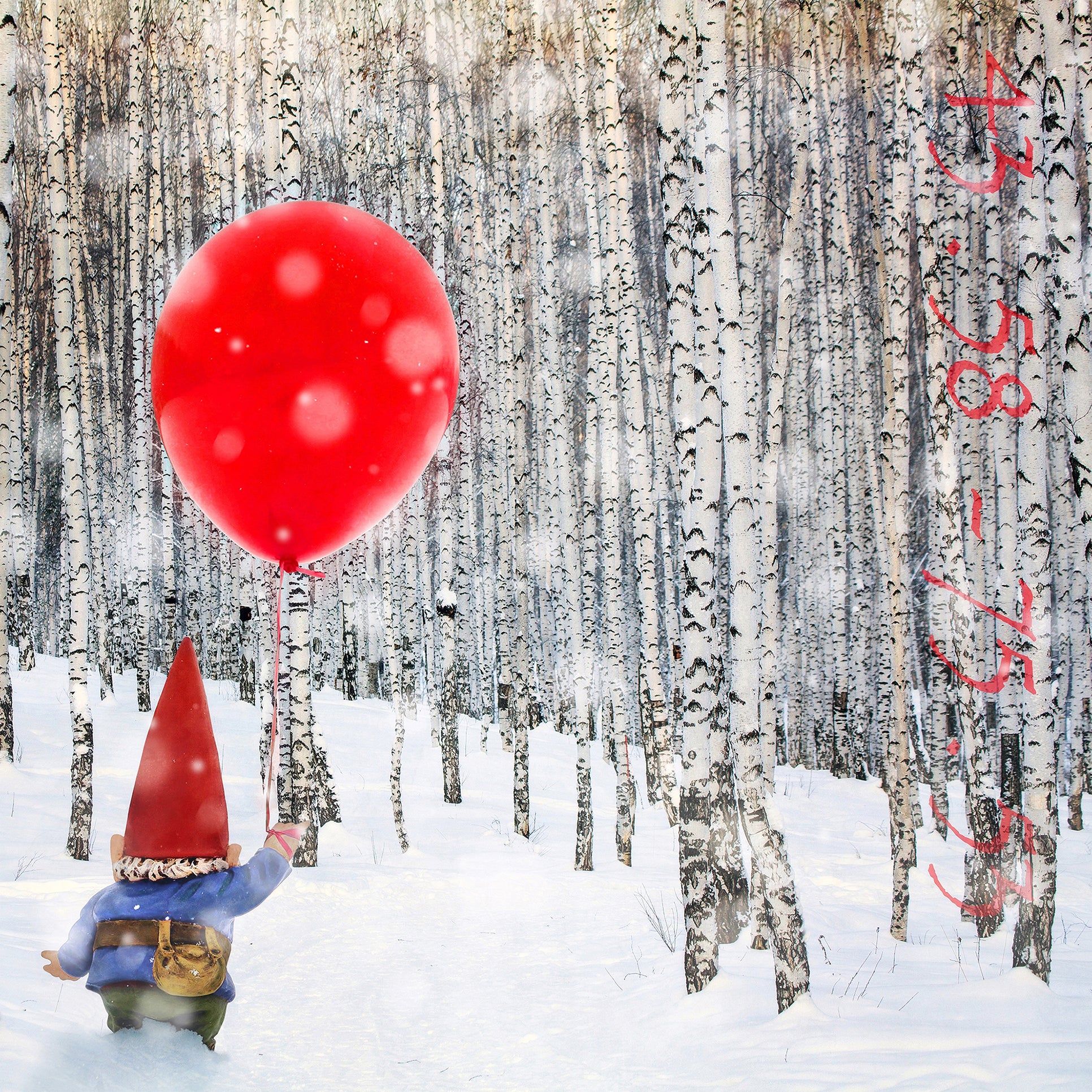 "A Winter's Journey" from the Whimsical Gnomes Series depicts a gnome embarking on a solitary trek through a snowy birch forest. Clad in a striking red hat and blue coat, the gnome holds a large red balloon. The landscape is enveloped in the silence of winter, with the balloon's vibrant hue standing out against the monochromatic background, hinting at a story of exploration and wonder amidst the stillness.