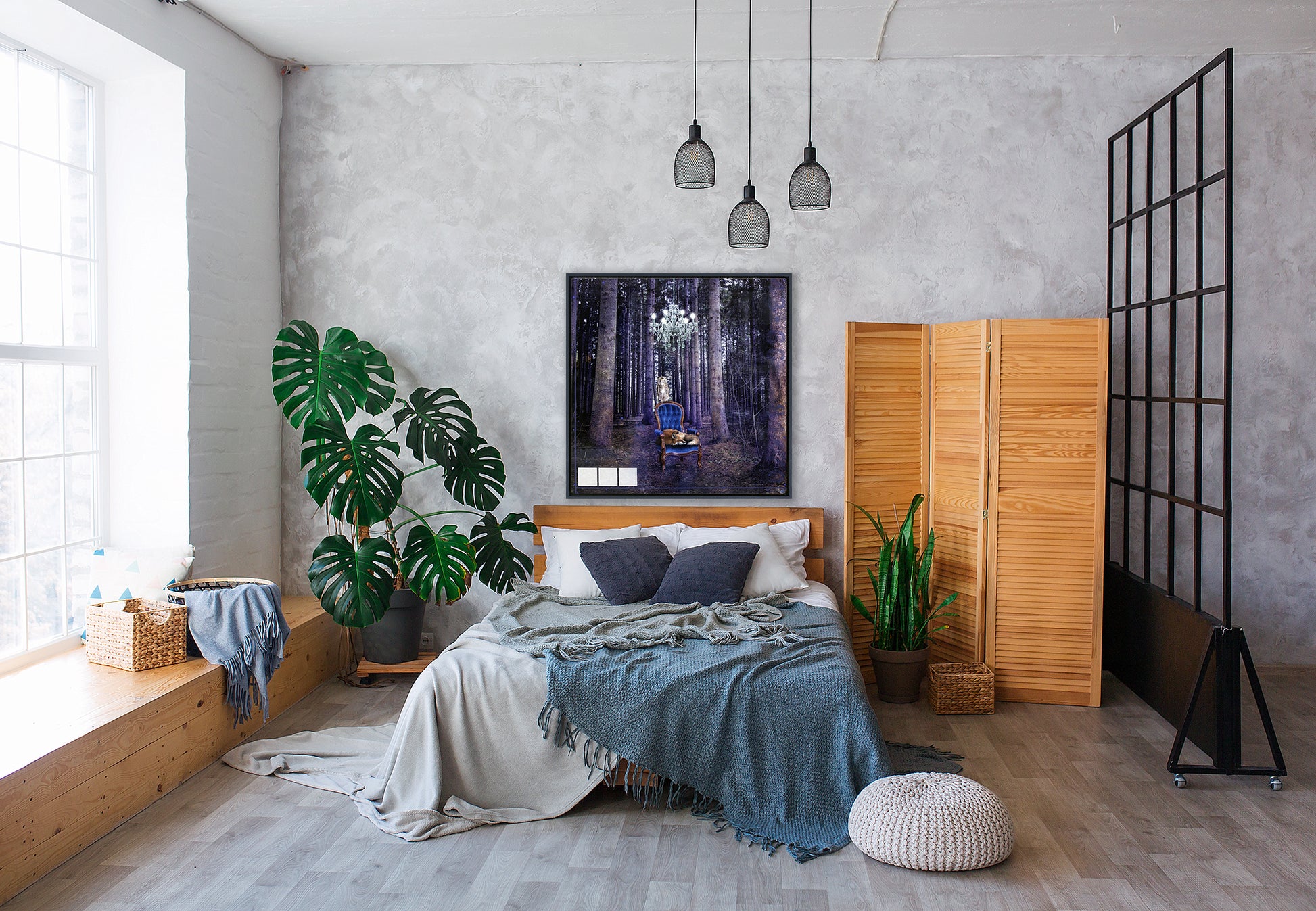 "Bonne Nuit" from the Animals Series by Morgan Jones features a tranquil forest scene at dusk with a sleeping fox on a vintage blue upholstered chair while an owl perches on the chair's back. An elegant chandelier hangs above, blending the natural world with a hint of domestic comfort.
