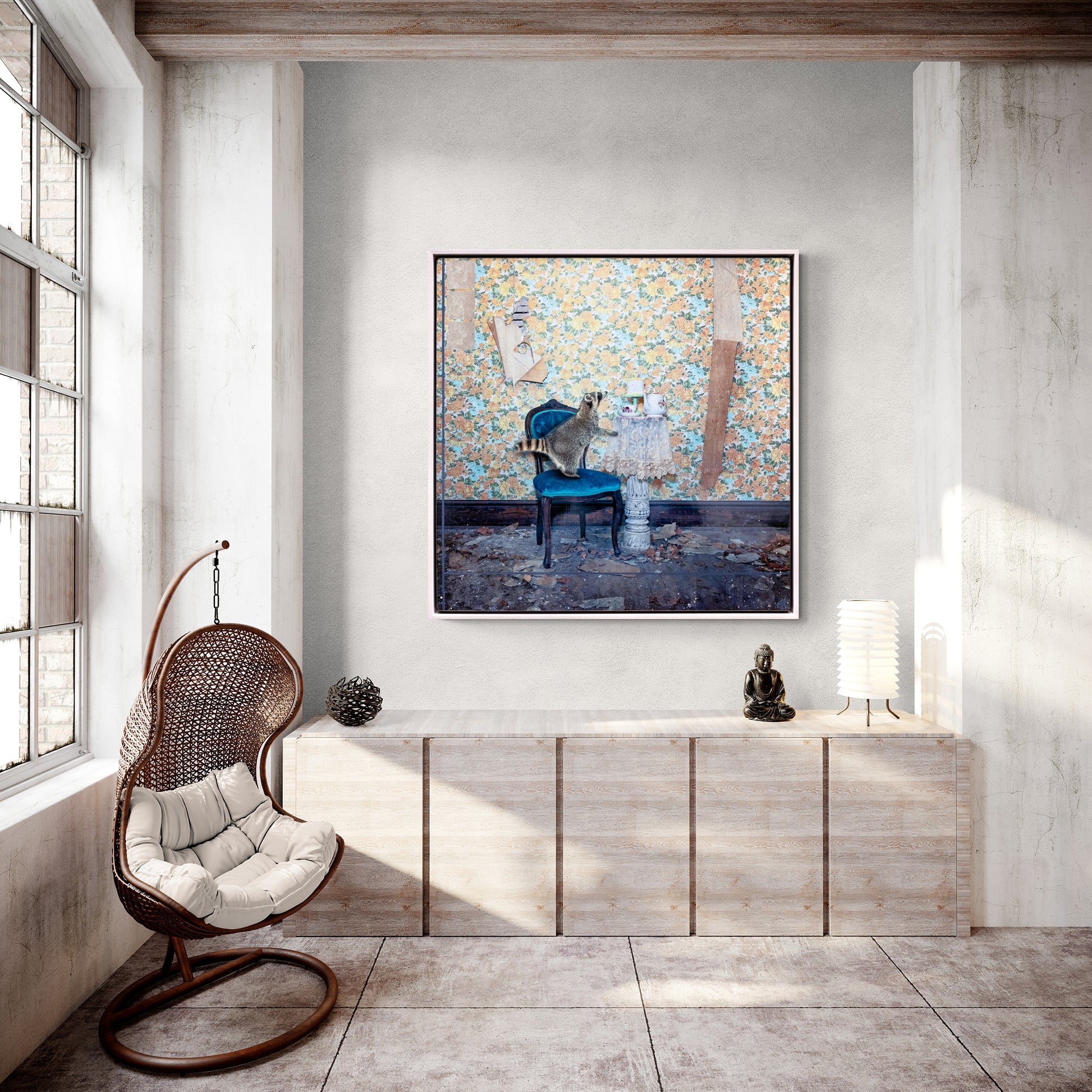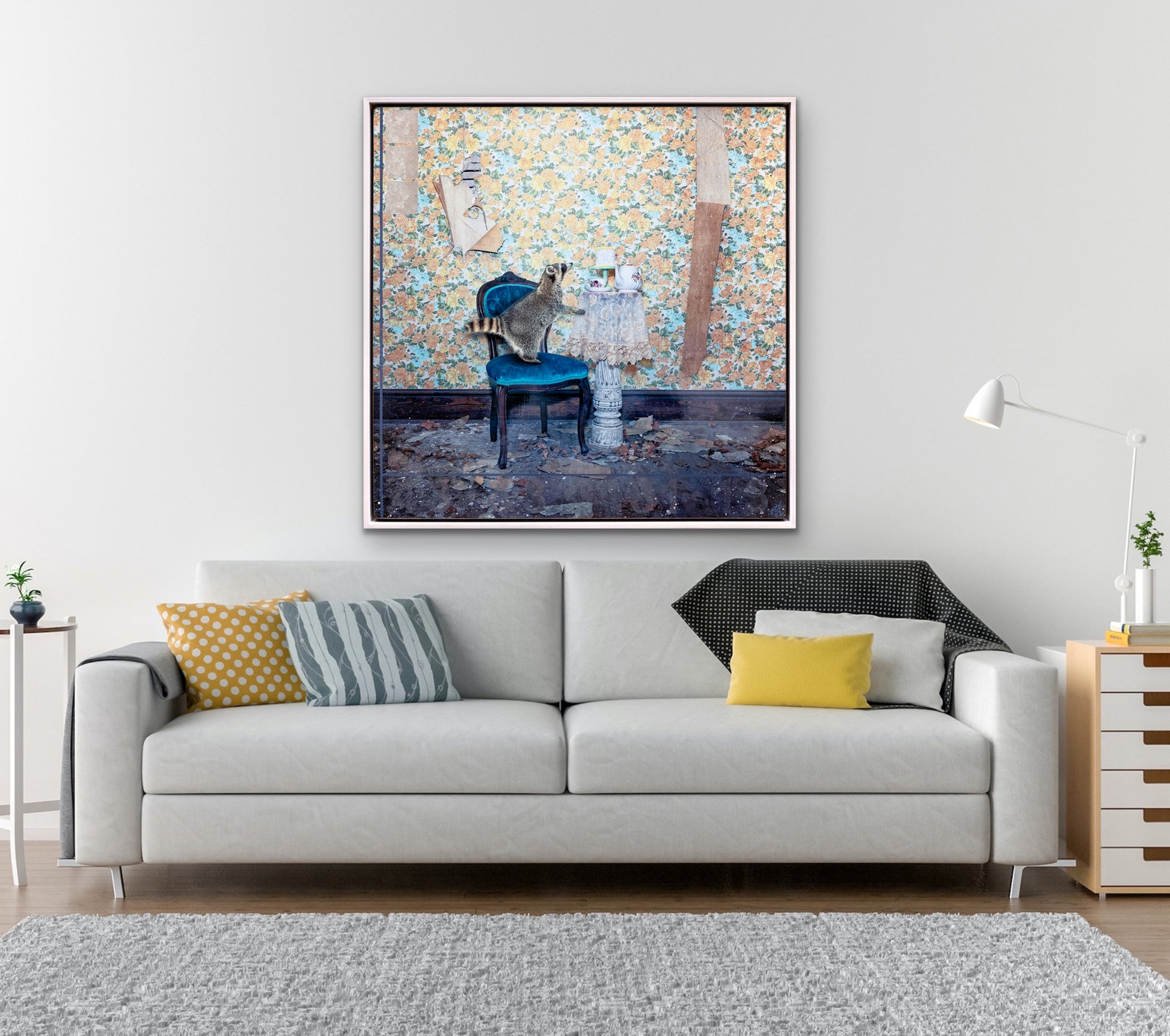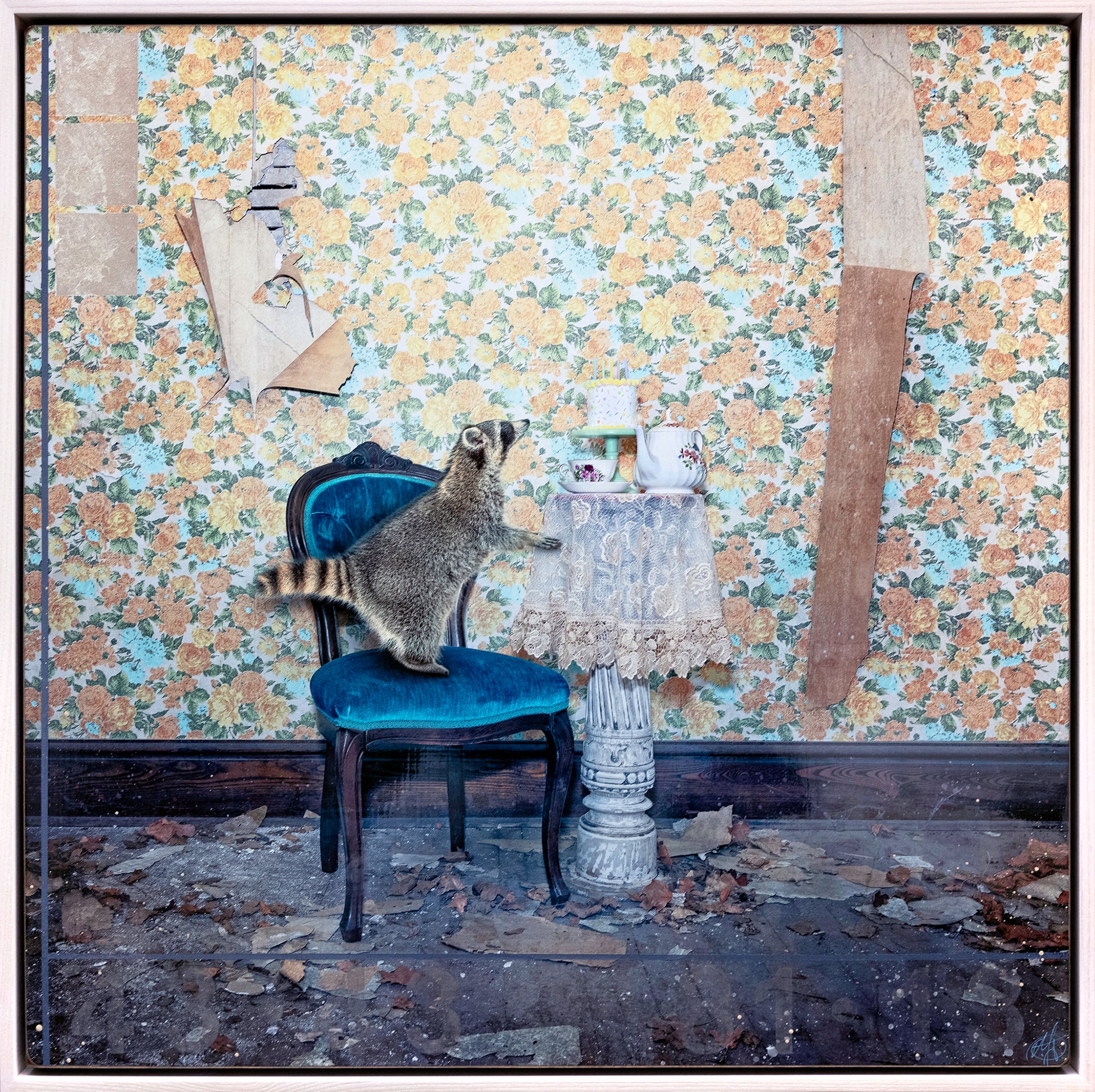 "Cake Heist" from the Animals Series by Morgan Jones portrays a raccoon on an antique blue chair reaching towards a table with a colourful birthday cake, teapot, and teacup. The scene is set in an abandoned farmhouse with vintage peeling floral wallpaper, juxtaposing the humorous and mischievous antics of the raccoon against the decay of a dilapidated home.