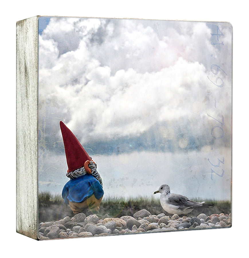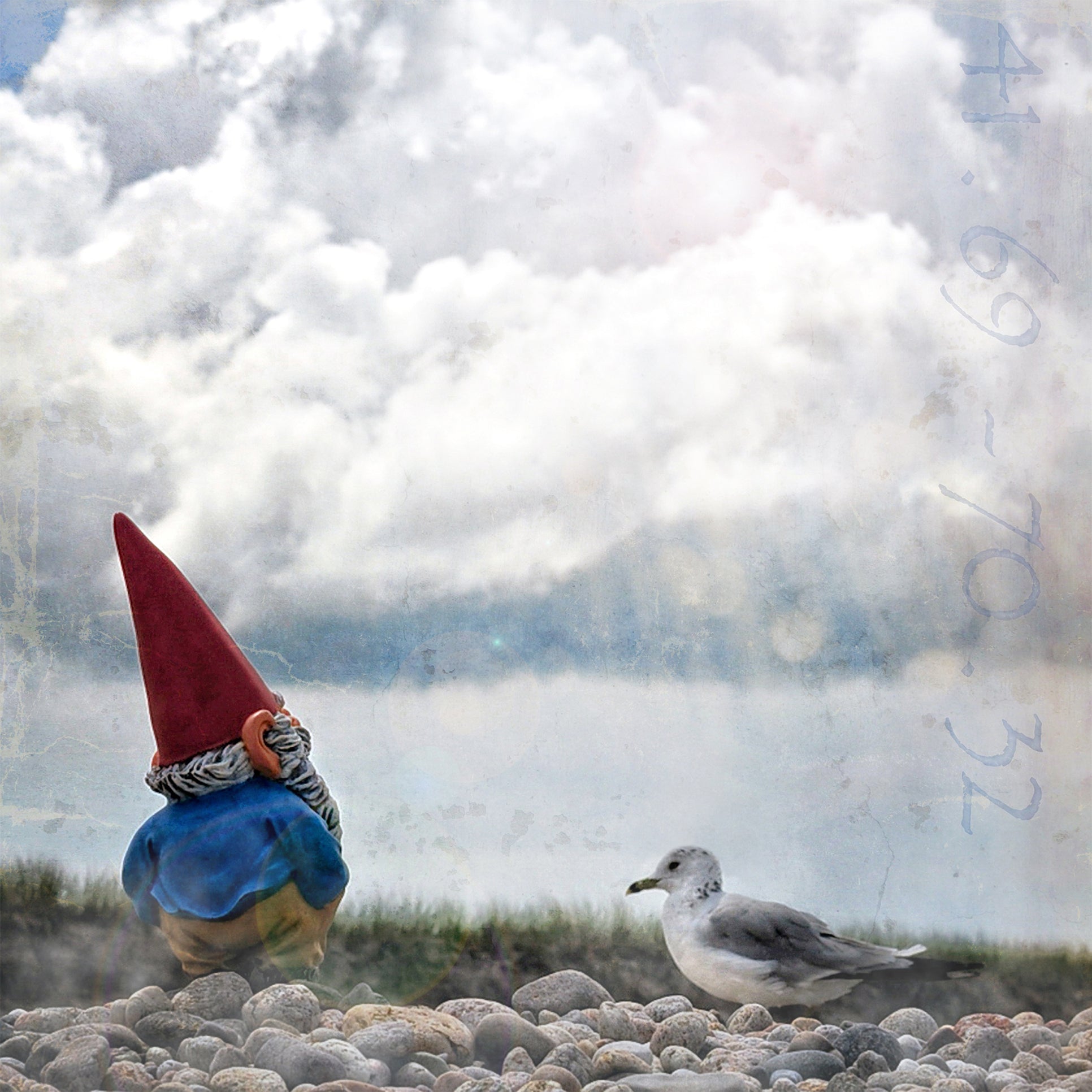 In the Wandering Gnomes Series, the artwork "Cloudy Days" showcases a gnome with a vivid red hat and a blue coat observing a seagull on a pebbled beach. An expansive overcast sky looms above, enhancing the pensive moodiness of the scene.