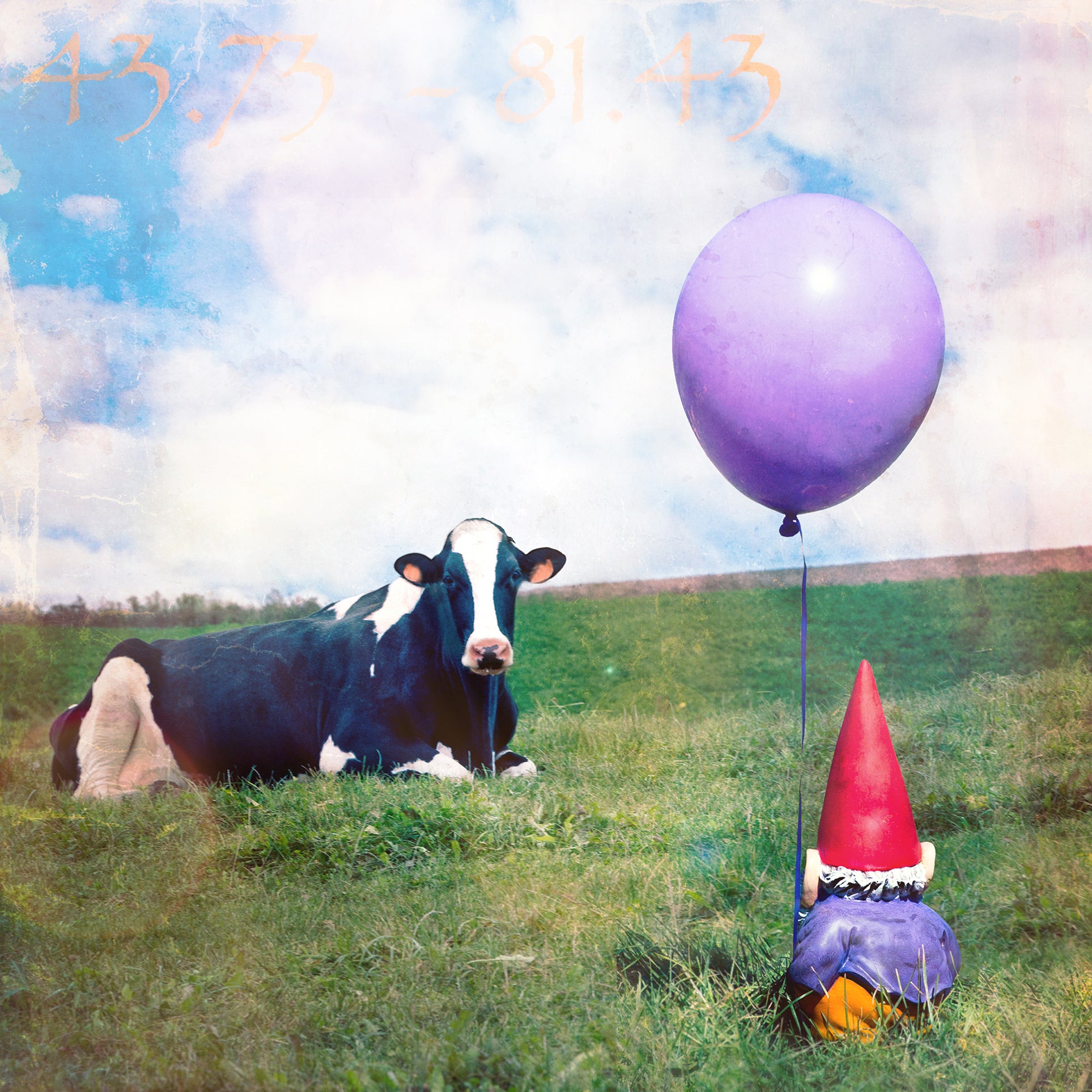The artwork "Moo" is part of the Wandering Gnomes Series and features a gnome with a vivid red hat, holding a purple balloon, facing a black and white dairy cow lying on a summery green field.