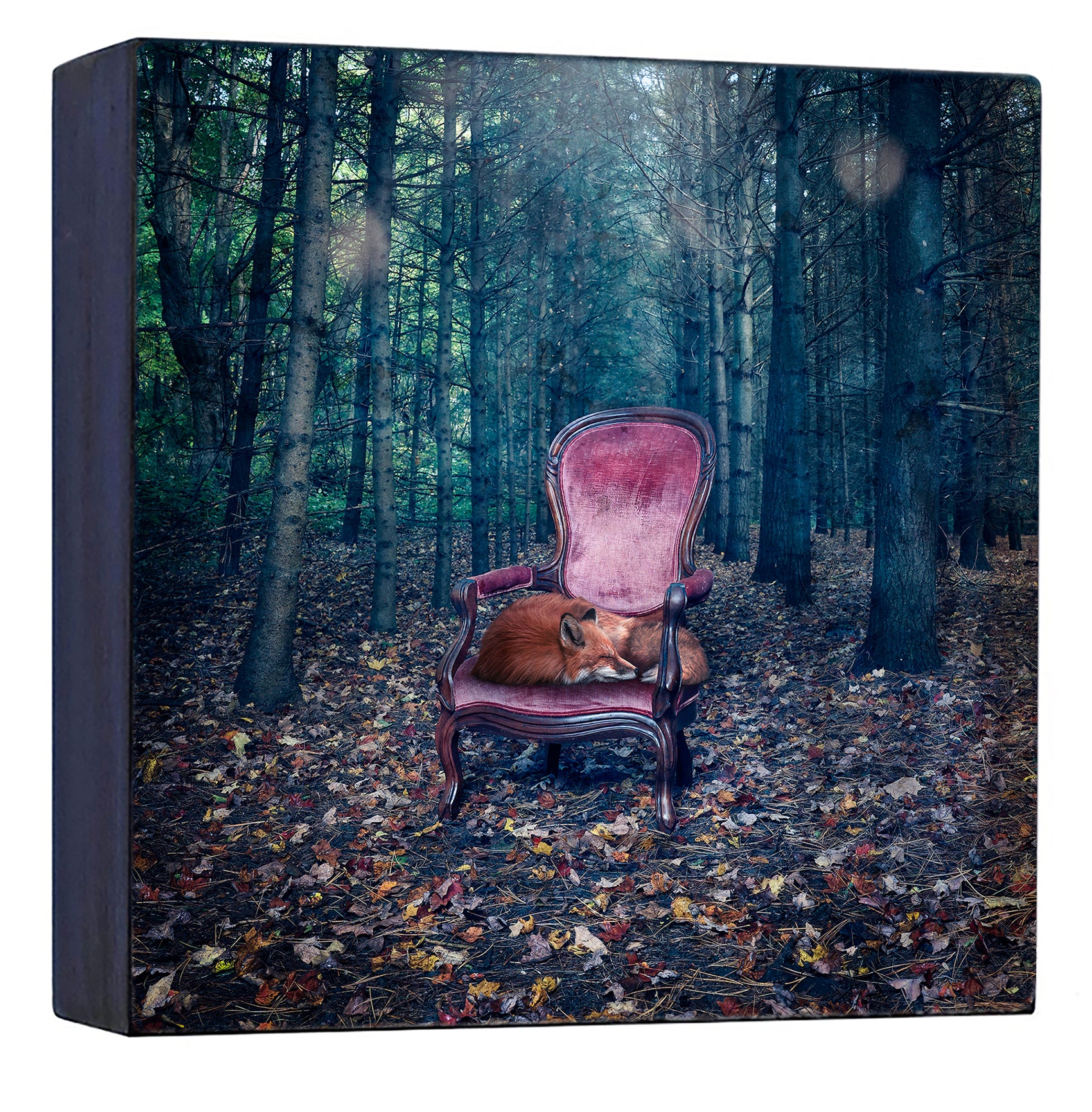 "Sweet Dreams" from the Animals Series by Morgan Jones portrays a sleeping fox curled up on a regal, red vintage chair in a peaceful forest setting.