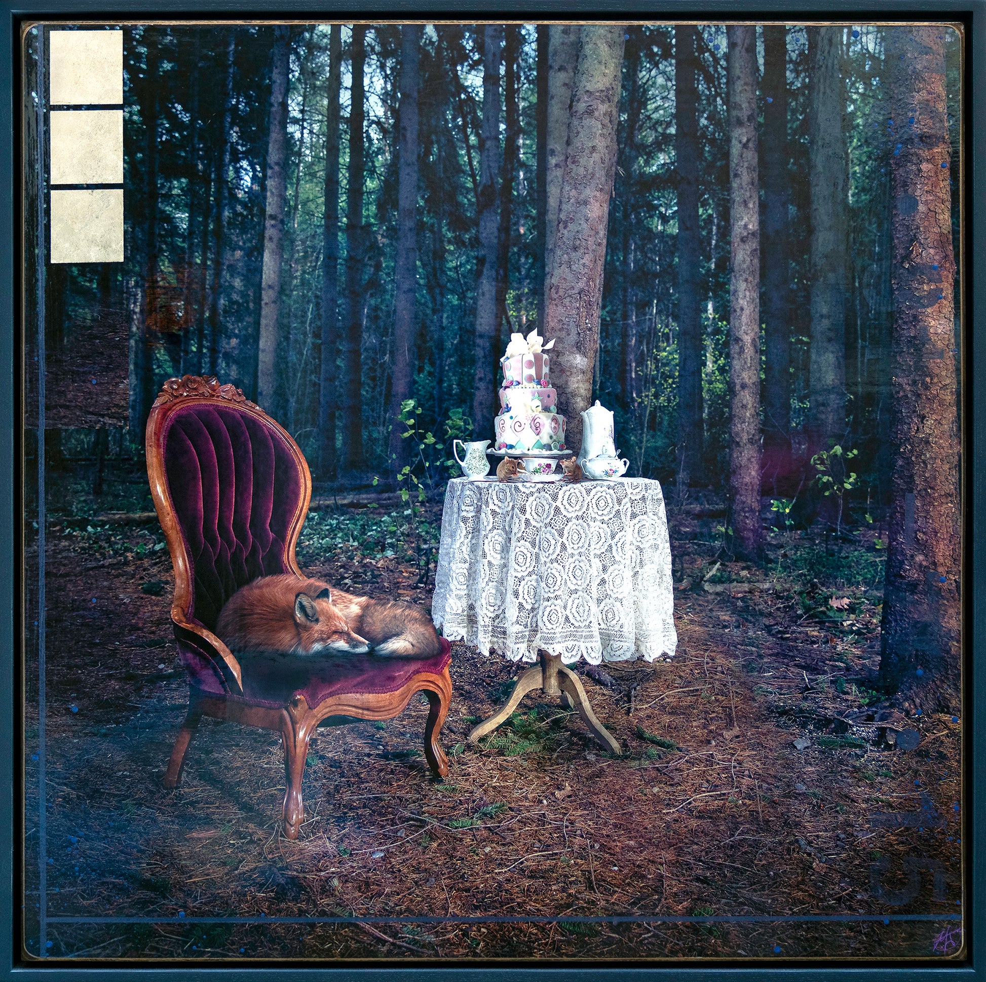 "Sweet Dreams" from the Animals Series by Morgan Jones portrays a sleeping fox curled up on a regal, red vintage chair in a peaceful forest setting. Beside it, a table draped with lace holds an elegant tea service, creating a serene and whimsical atmosphere amidst the trees.