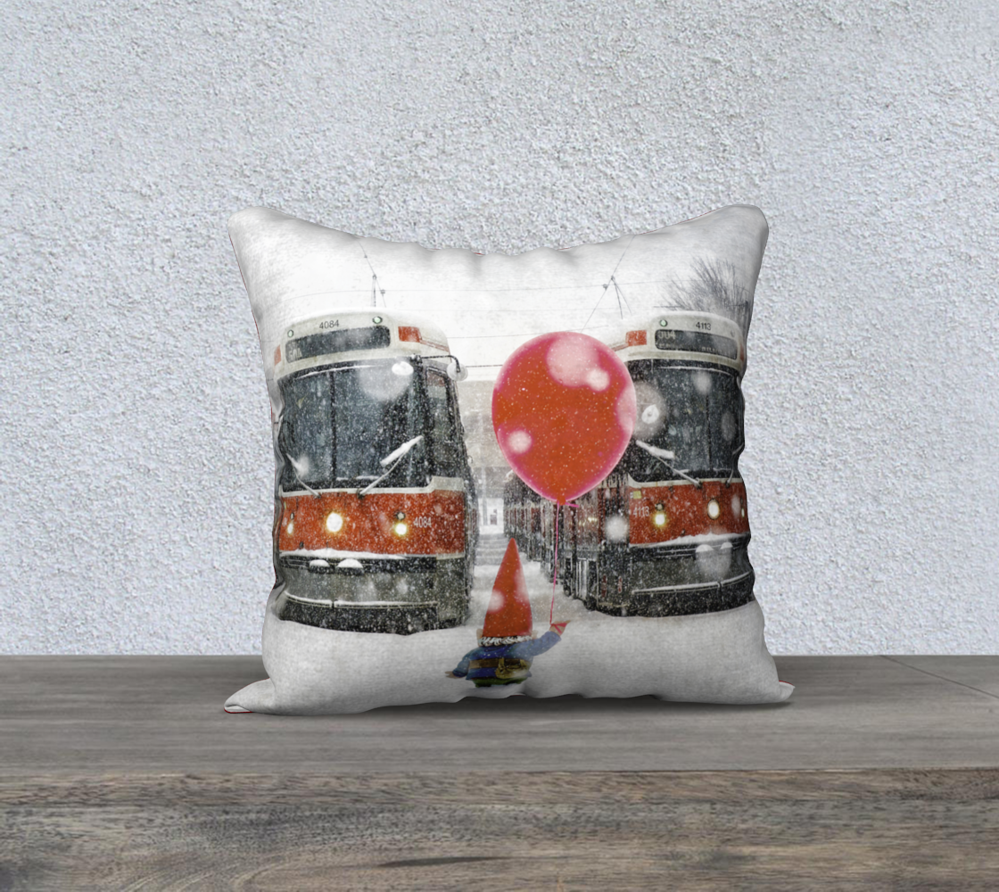 "The Commute" from the Wandering Gnomes Series captures a solitary gnome braving a snowstorm with a single red balloon. The scene is set in Toronto’s wintery east-end stockyards where a row of Toronto Transit Commission (TTC) streetcars stands in waiting, their lights a warm contrast to the cool snow.
