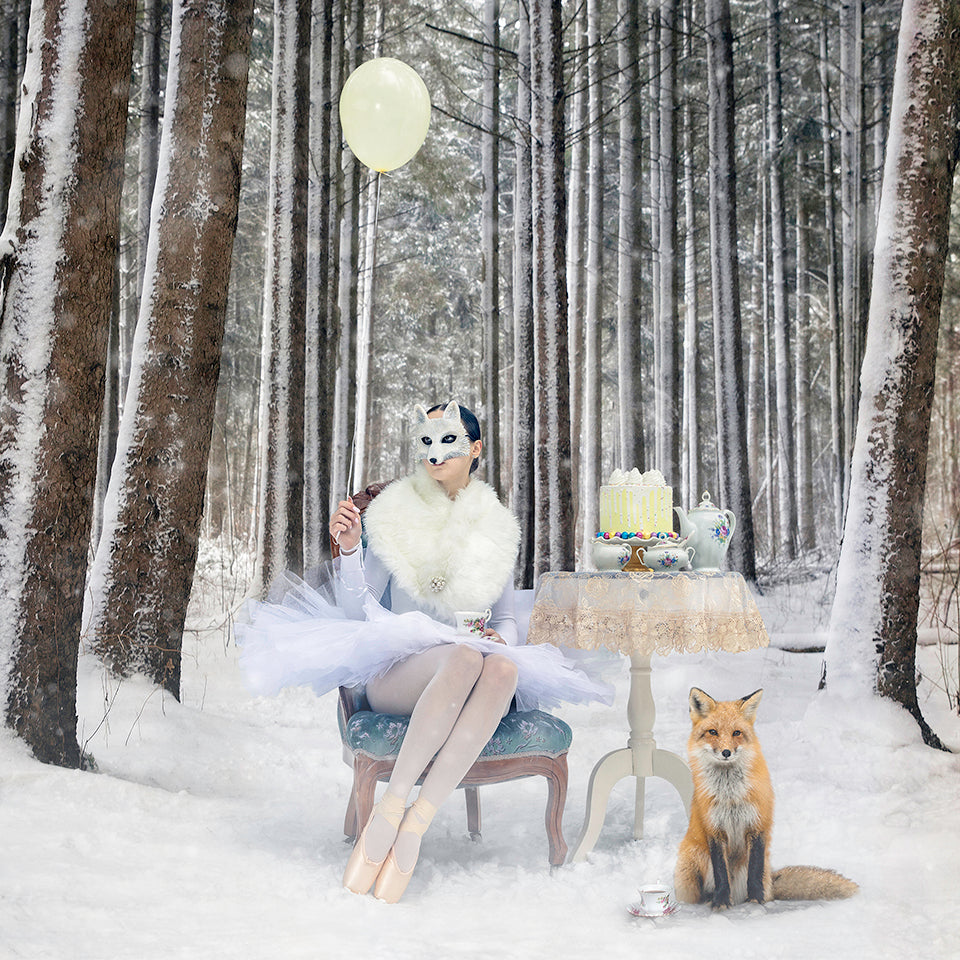 "The Companion" from Morgan Jones's Masked Series features a ballerina wearing a white fox mask and white tutu, sitting in an elegant chair amidst a winter wonderland beside a tea setting with cake. A red fox sits in the snow beside her keeping watch. This piece is whimsical and surreal.