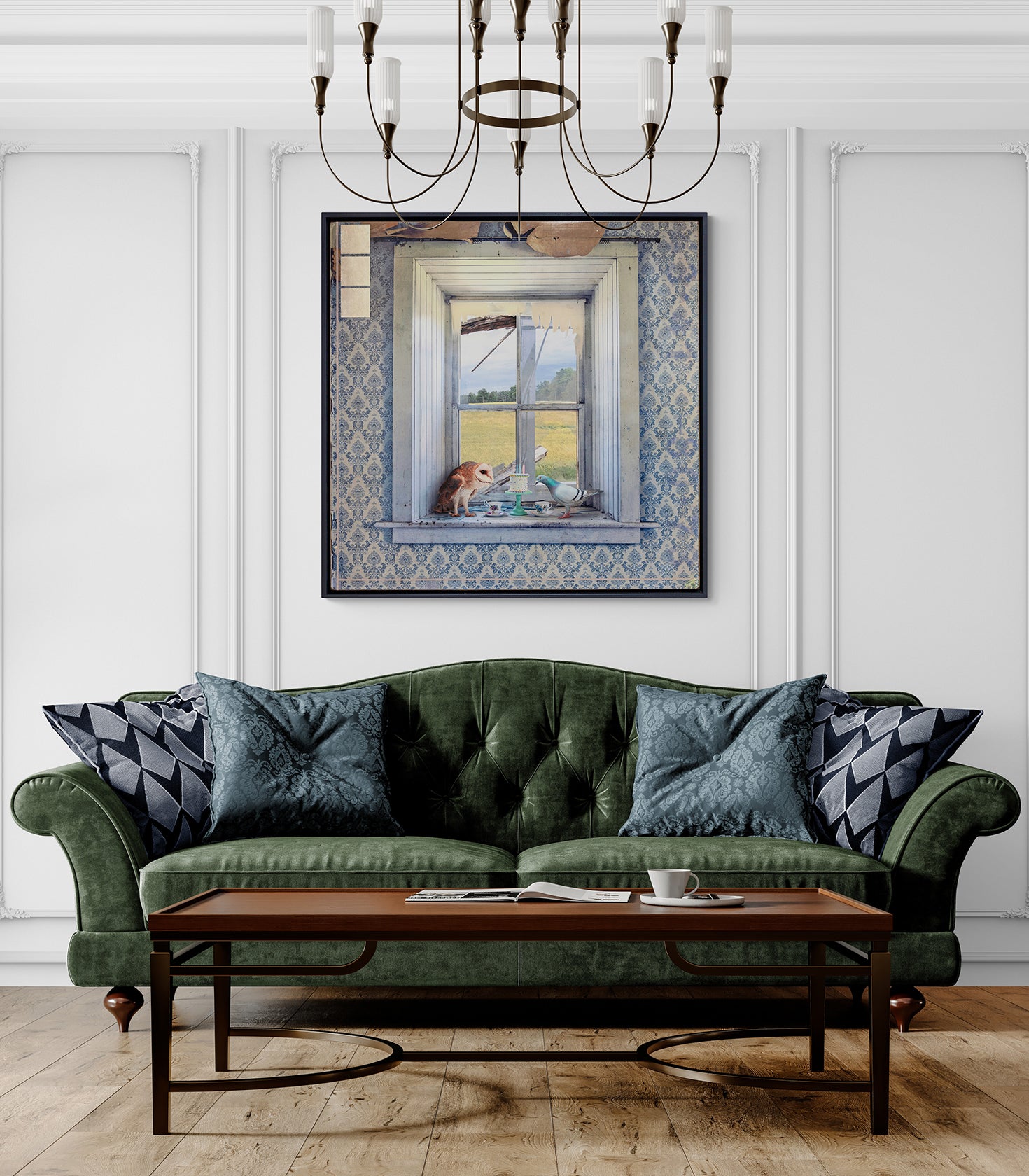 "The Conspiracy" is part of Morgan Jones's Animals collection, featuring a barn owl on a dilapidated windowsill looking intently at a single pigeon as they look at each other across an afternoon tea setting. The view through the window reveals serene summer farmland, all encapsulated by the rustic charm of the window's worn frame.