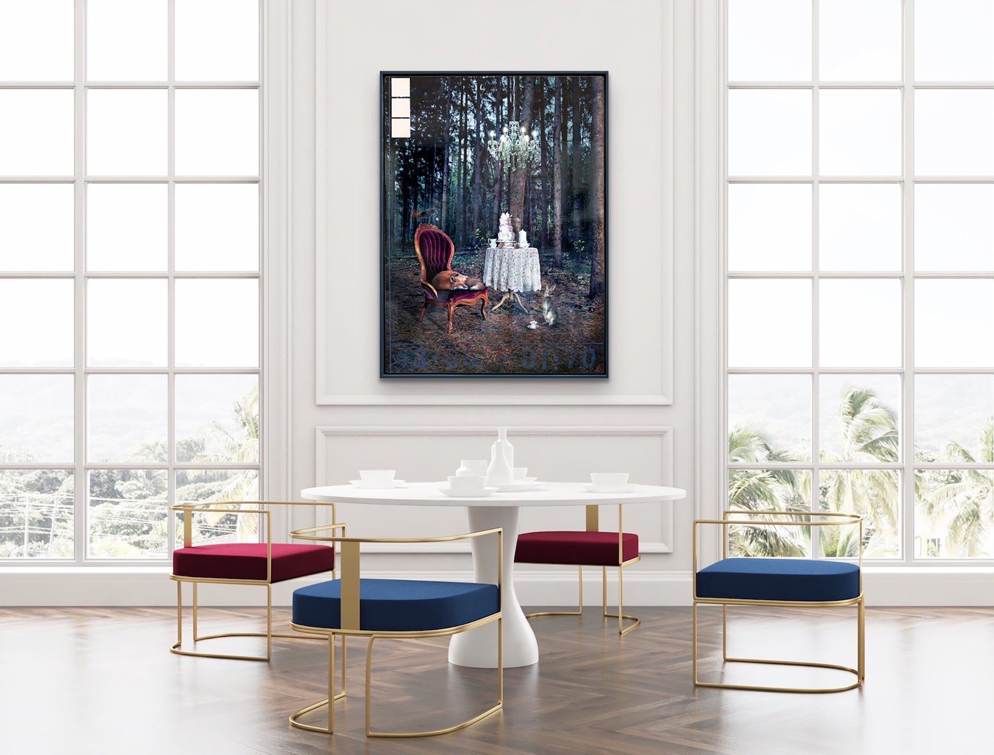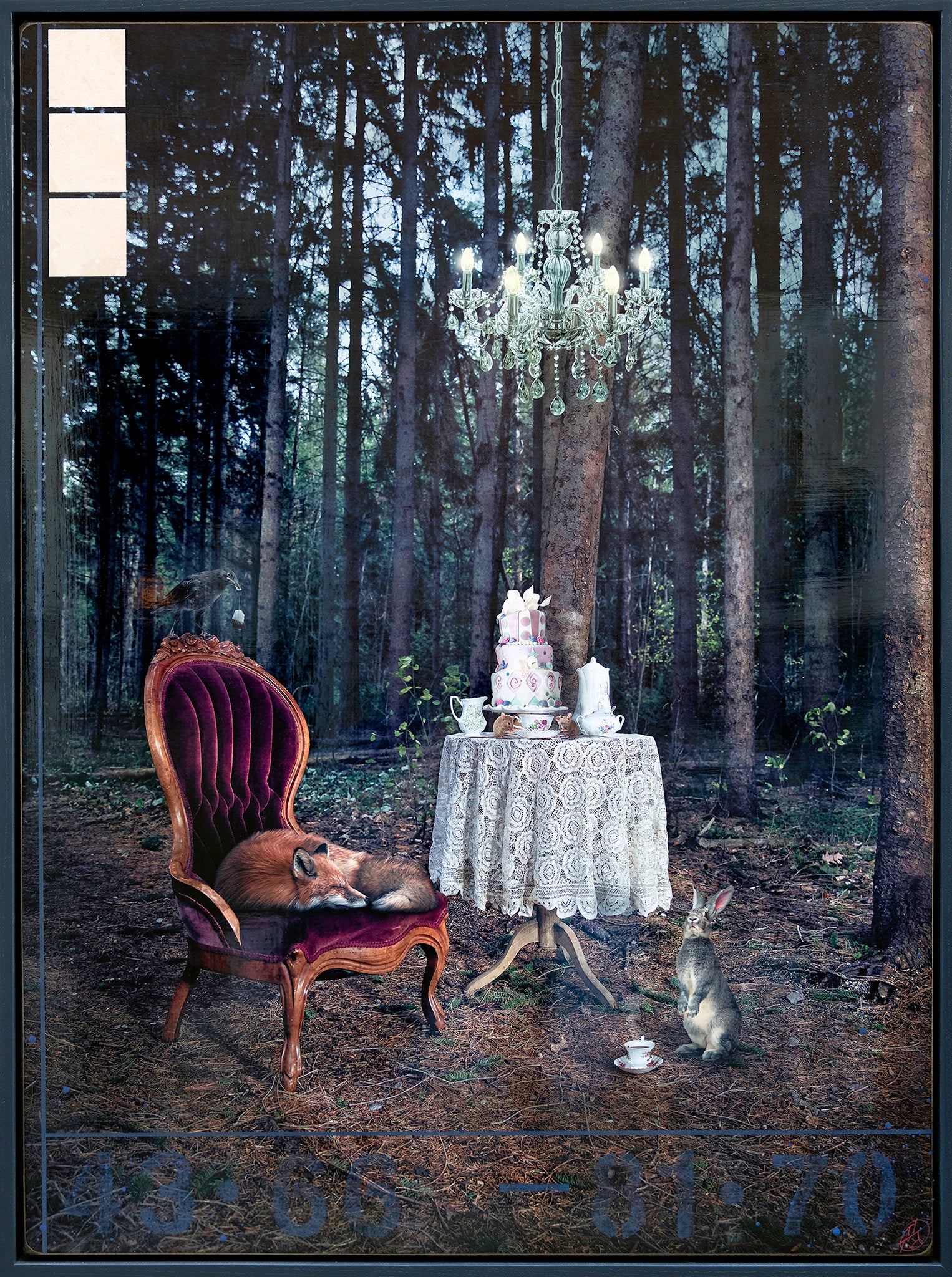 "The Gathering" from the Animals Series by Morgan Jones portrays a sleeping fox curled up on a regal, red vintage chair in a peaceful forest setting. Beside it, a table draped with lace holds an elegant tea service, creating a serene and whimsical atmosphere amidst the trees.