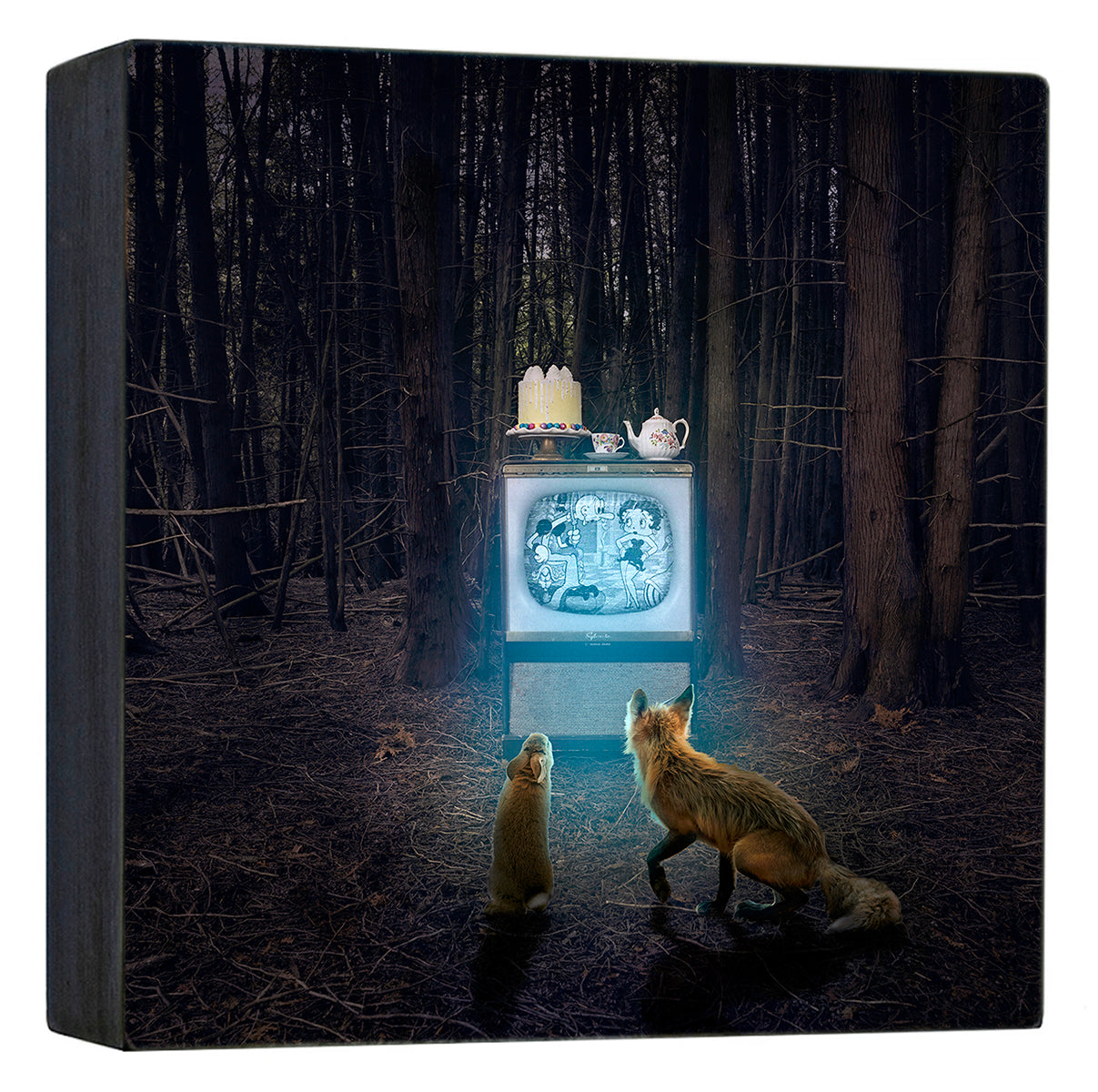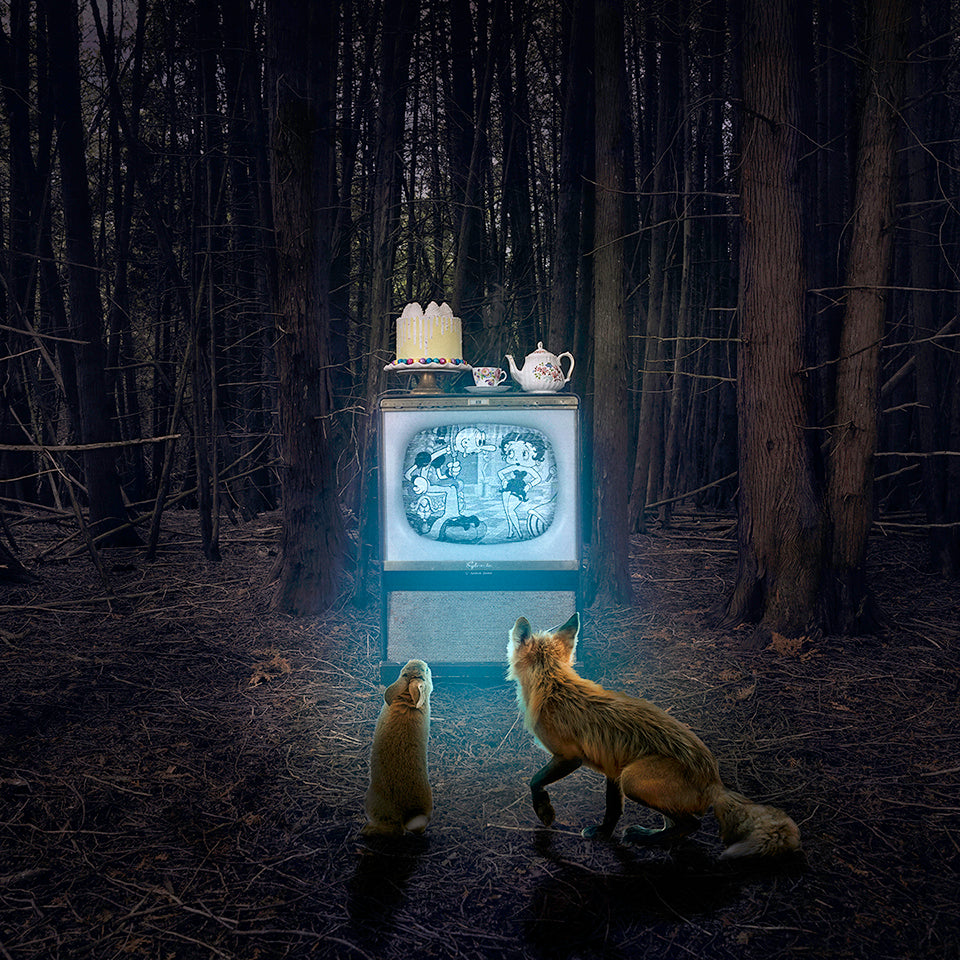 "The Looking Glass" from the Animals Series by Morgan Jones depicts a moody, darkened wooded clearing where a Fox and a Rabbit have stumbled upon an old episode of Betty Boop playing on a vintage TV mysteriously placed in the middle of the woods. The soft, bluish glow of the TV illuminates the unlikely pair as they sit captivated. Set on top of the TV is a cake and tea setting.