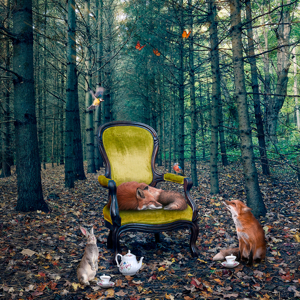 "The Secret Hour" from the Animals Series by Morgan Jones depicts a whimsical afternoon gathering in a forest glade. A fox naps on a regal chartreuse chair, while a rabbit and curious fox await their tea. Song birds and monarch butterflies passing by decider to join in the fun as sunlight streams through the forest canopy.