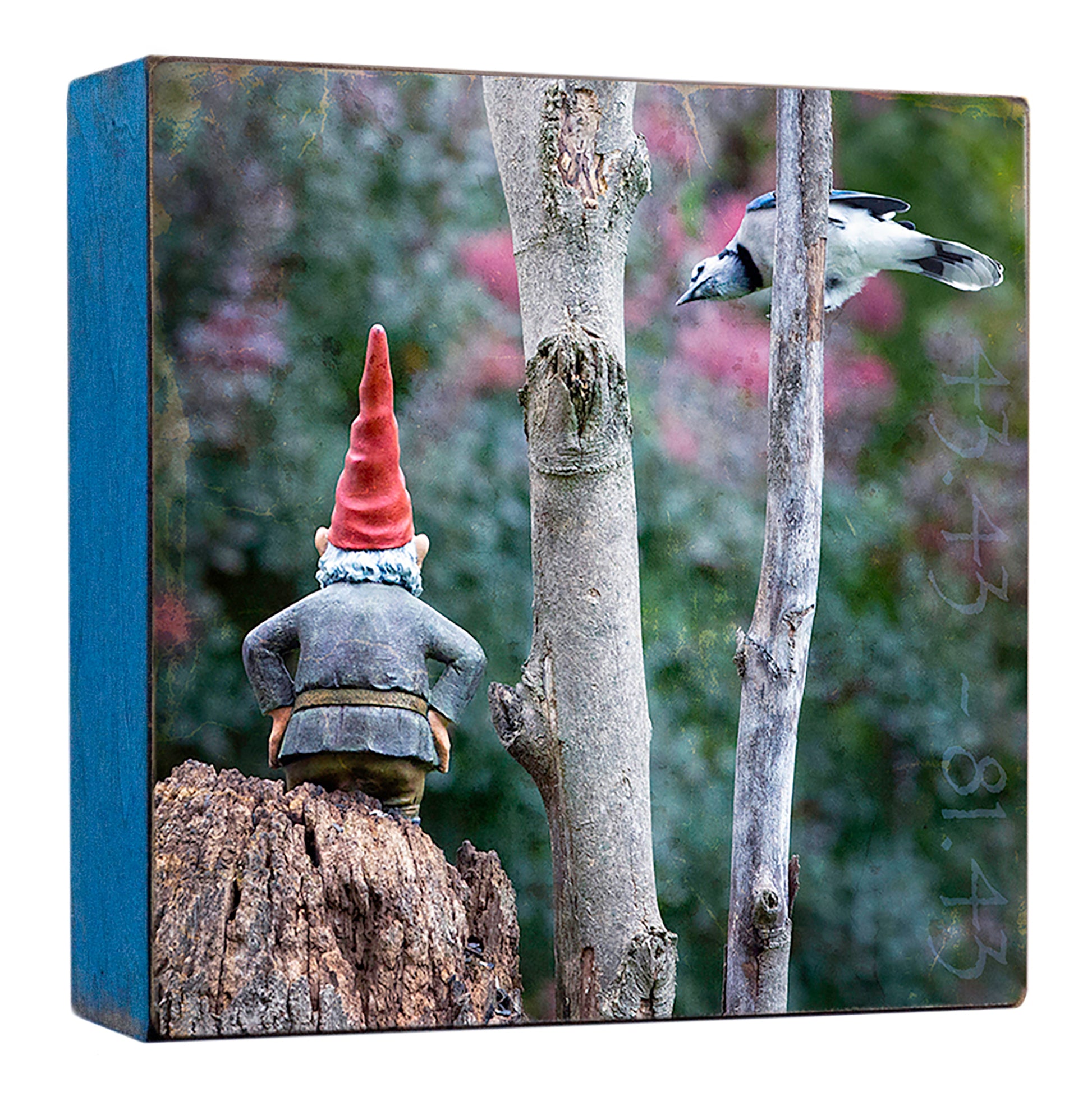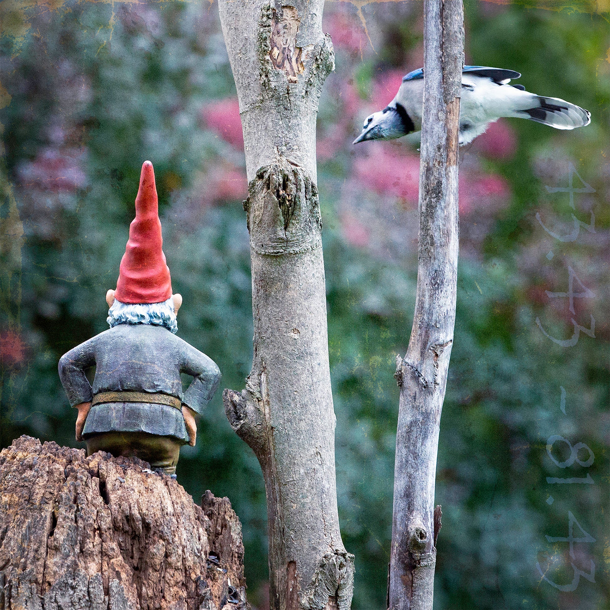 In the artwork "The Visitor" from the Wandering Gnomes Series, a solitary gnome stands contemplatively on a tree stump. His gaze is directed toward a Blue jay perched on the trunk of an adjacent tree. The backdrop of soft-focus foliage and the gentle colour palette of Autumn contribute to the serene and enchanting atmosphere of the scene.