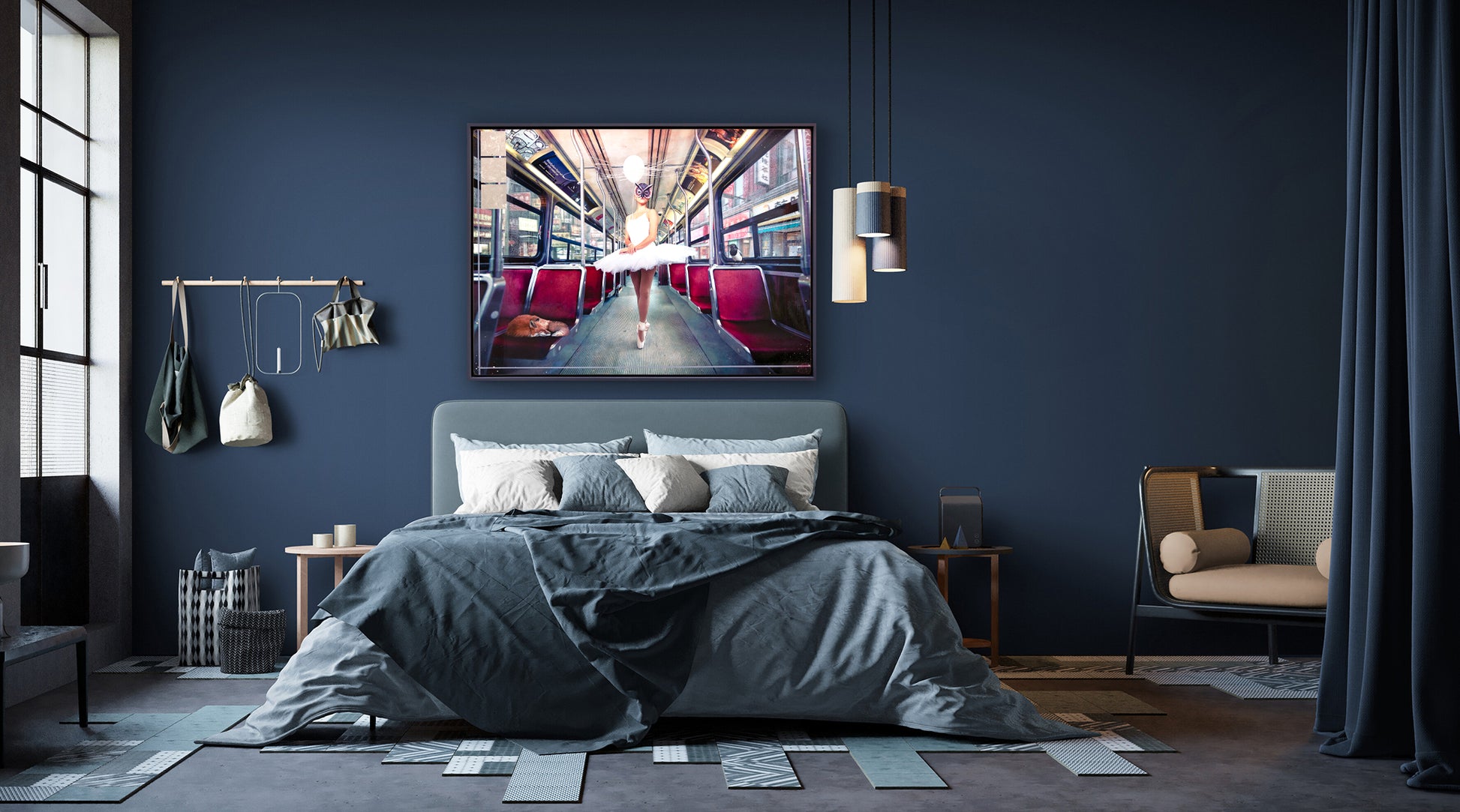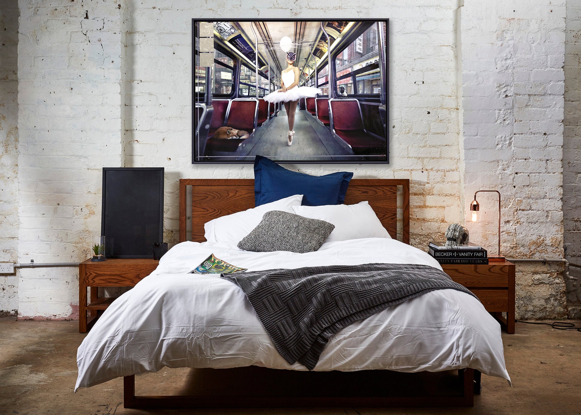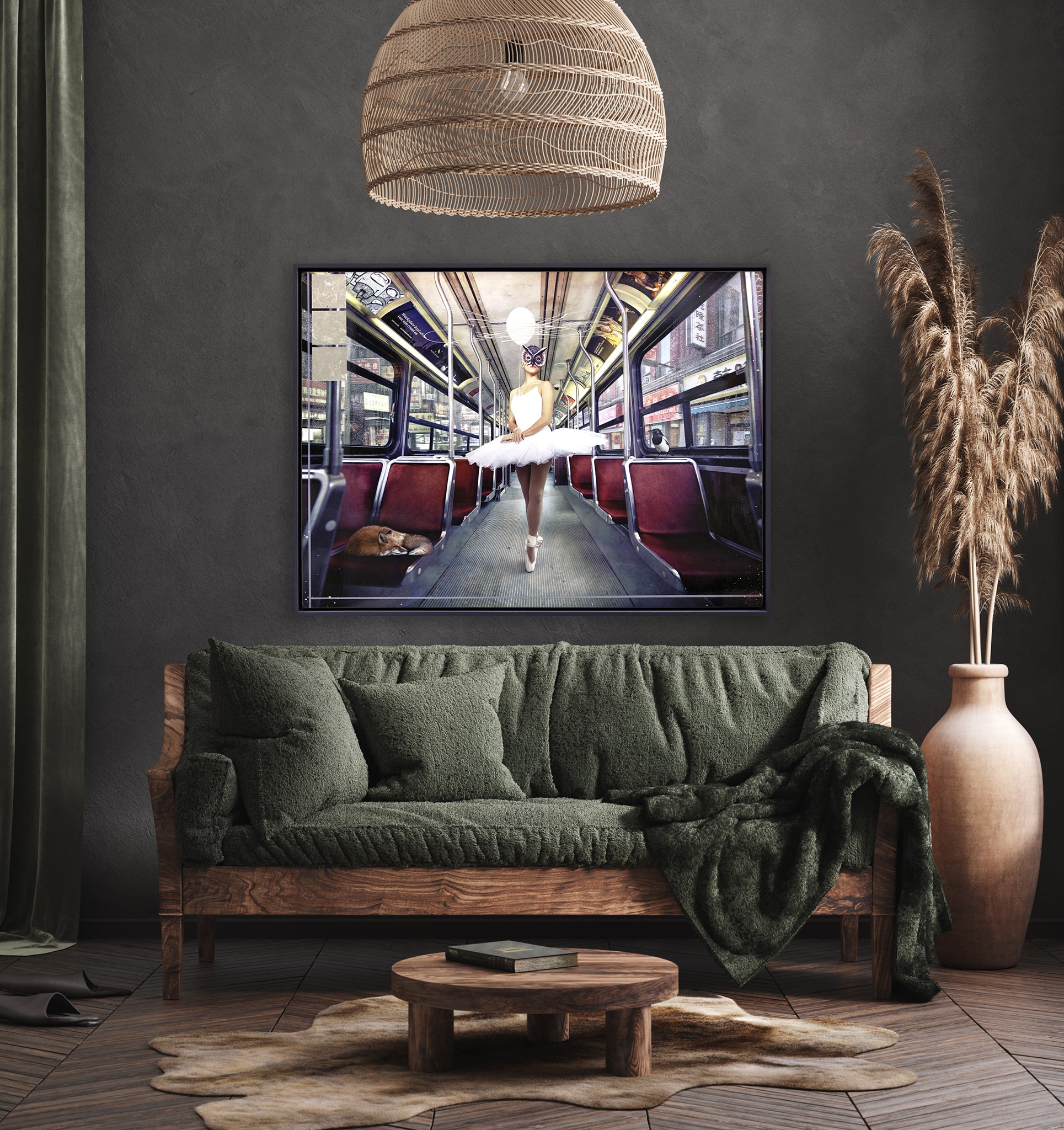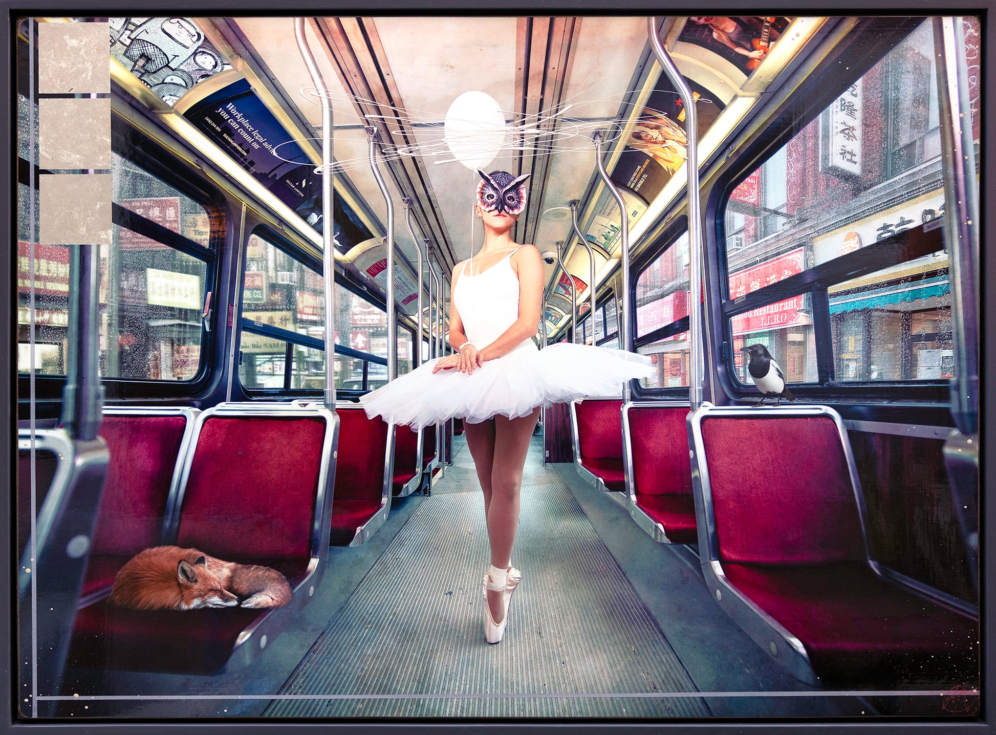 "Traveling Companions" part of Morgan Jones's Masked Series, portrays a ballerina wearing an owl mask riding a Toronto Transit Commission (TTC) streetcar, joined by a slumbering fox and a watchful magpie as unlikely fellow passengers. The scene combines the everyday with the fantastical, set against Chinatown, visible through the vehicle's windows.