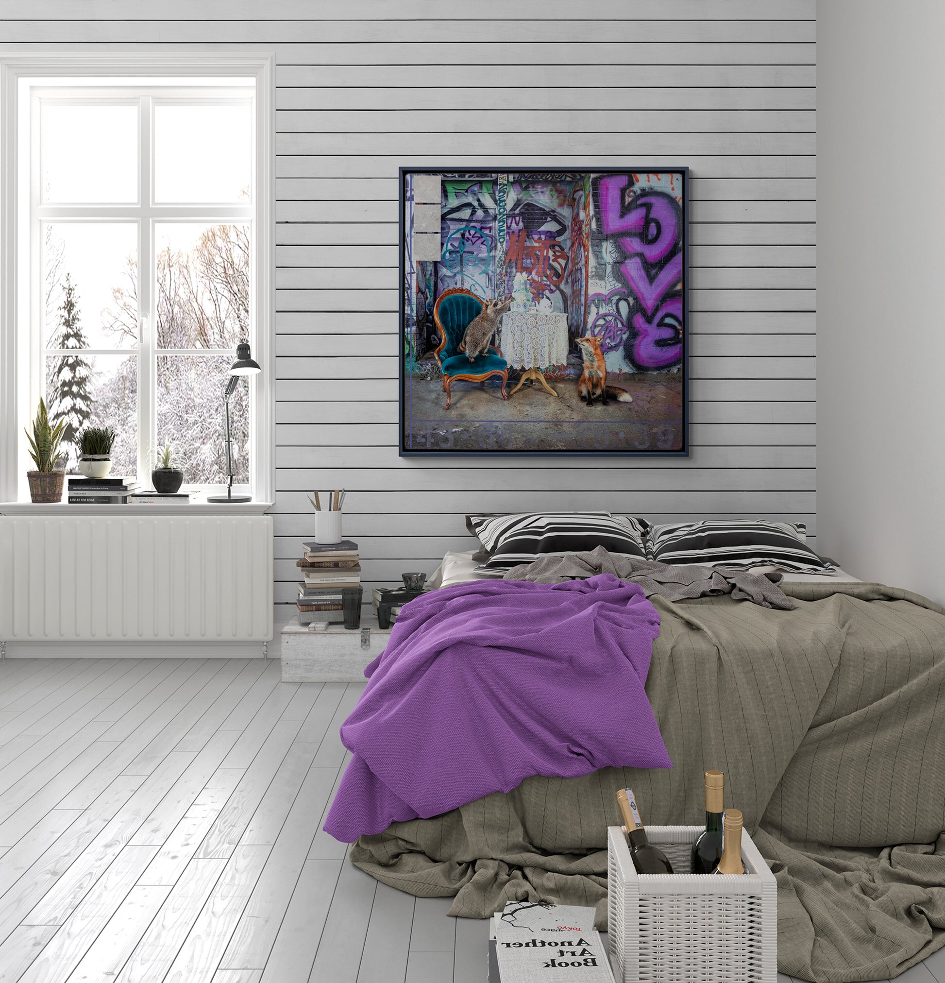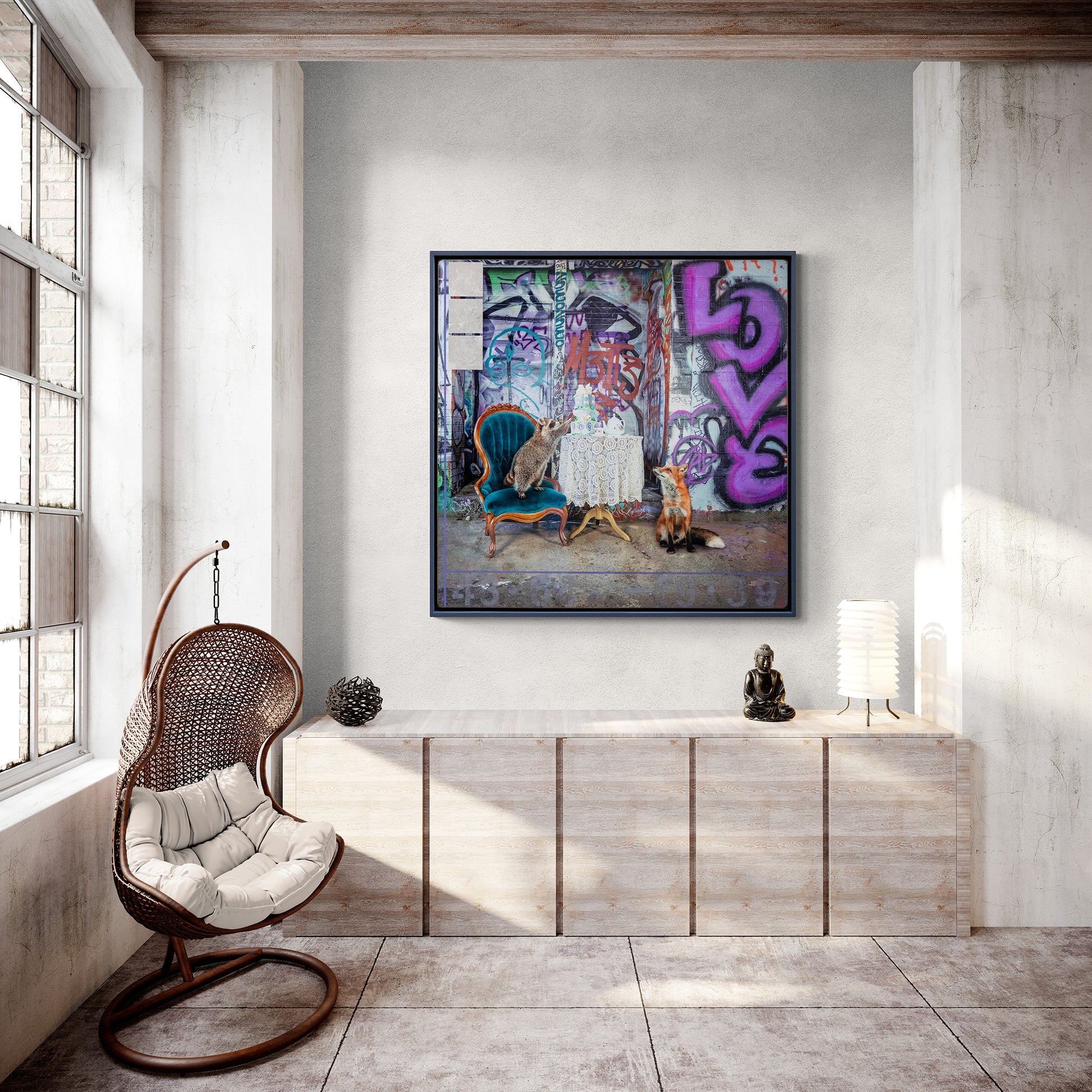 "Sweet Tooth" from the Animals Series by Morgan Jones showcases a raccoon on a vintage chair and a fox, both captivated by a colourful cake on a table set for afternoon tea against a wall covered in vibrant graffiti. The word “Love” in graffiti is featured prominently on the right-hand side. This piece juxtaposes urban street art with the curious, natural behaviour of the animals.