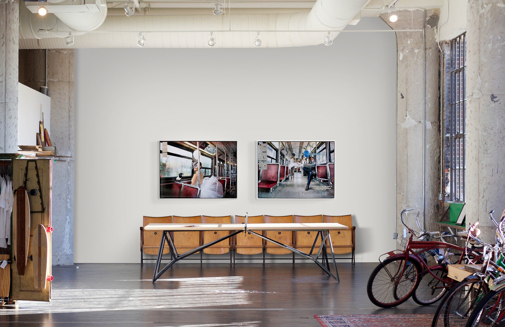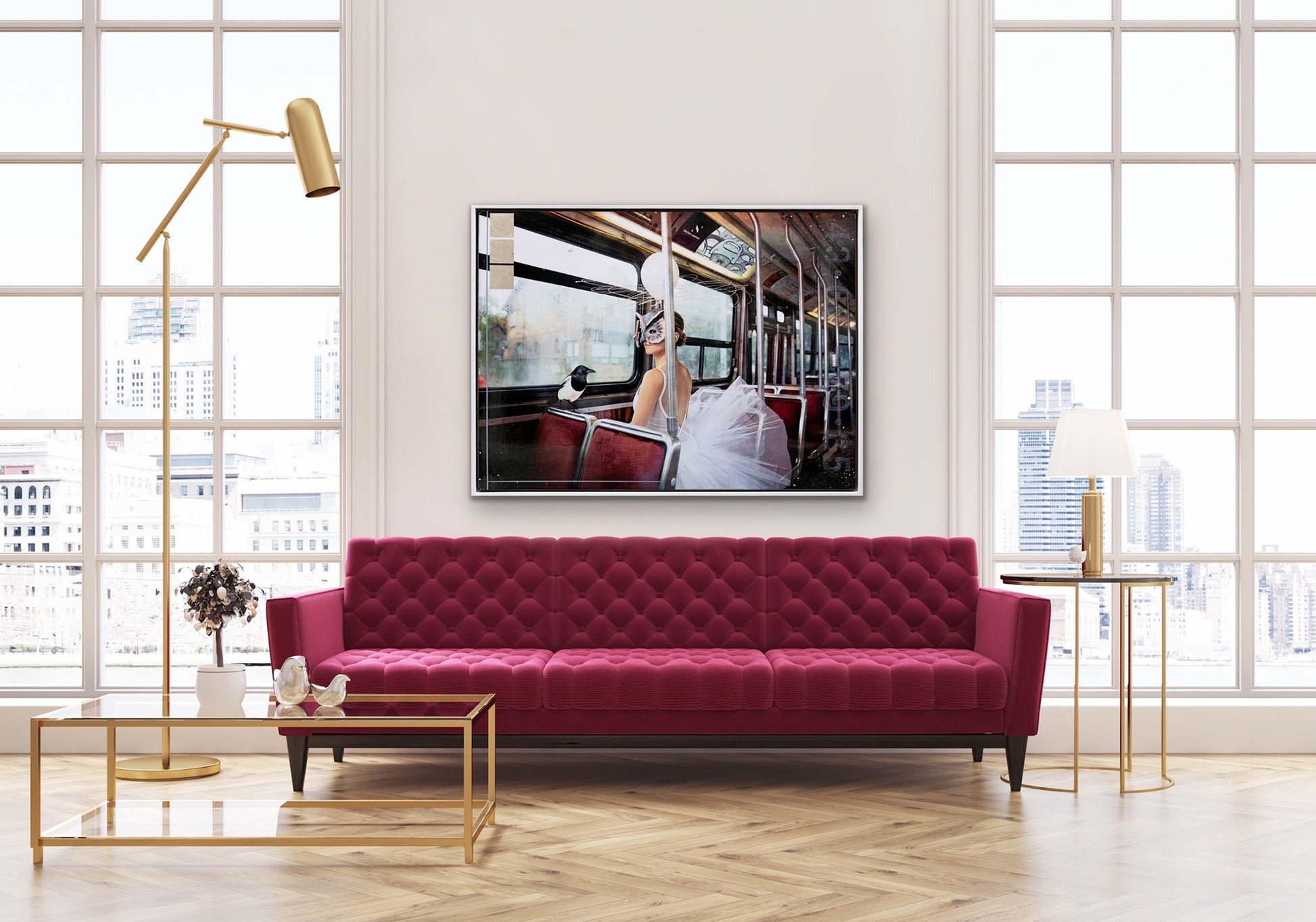 "Wistful Thinking" from the Masked Series by Morgan Jones features a ballerina in an owl mask seated on a Toronto Transit Commission (TTC) streetcar, with a magpie companion perched nearby. Swirls above hint at the ballerina's contemplative mood, while the streetcar's interior and rain-streaked windows set a scene of quiet introspection amidst urban chaos.